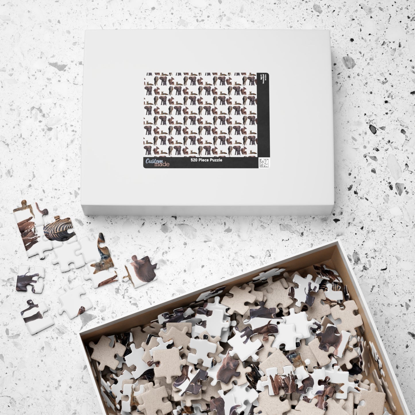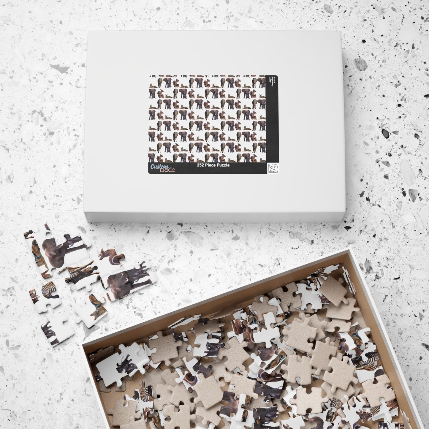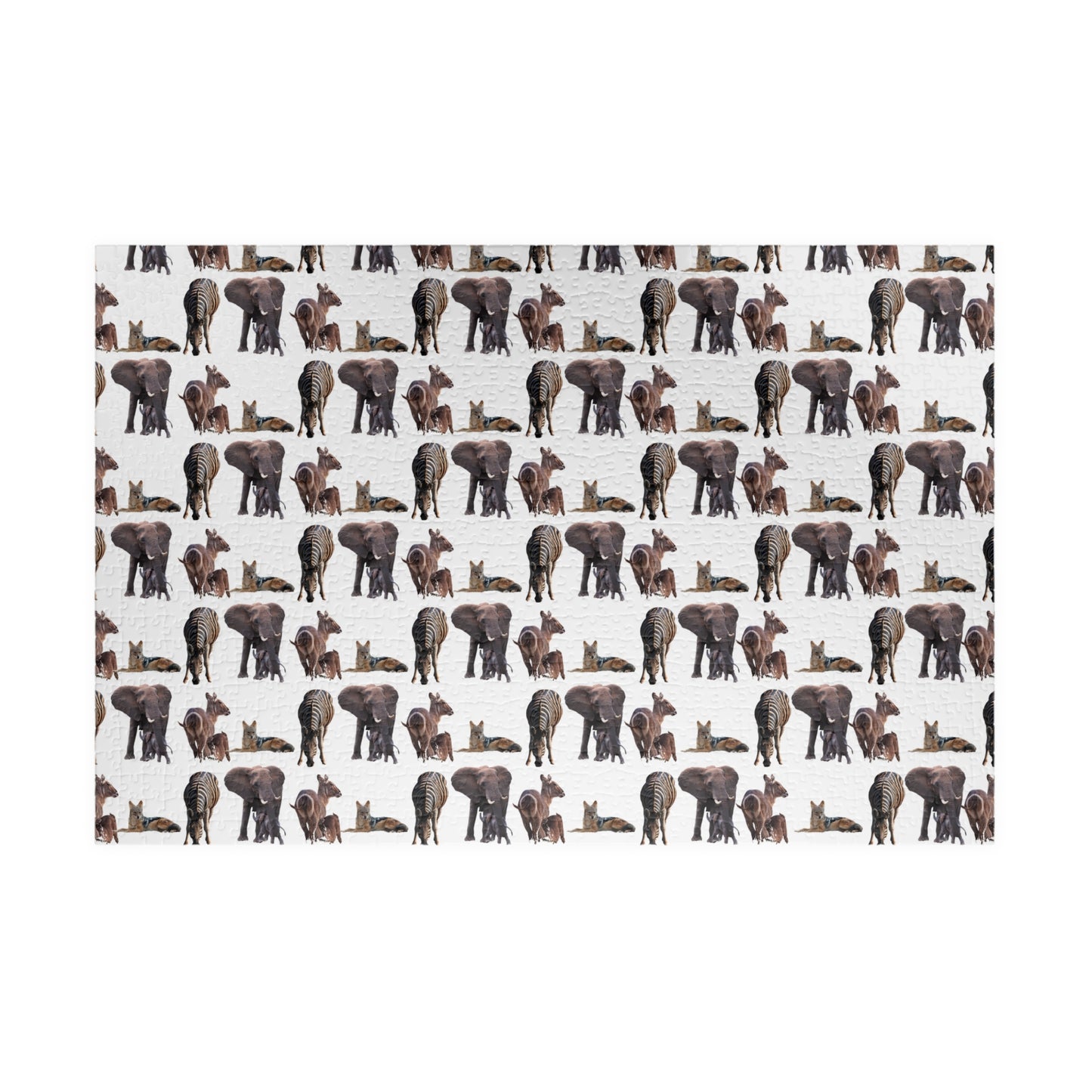 This African animal super difficult puzzle showcases an intricate design where elephants, zebras, jackals, and waterbucks elegantly repeat throughout the artwork. The challenge lies in piecing together these vibrant animals and distinguishing their subtle variations, making it an enjoyable test for puzzle enthusiasts and animal lovers alike.