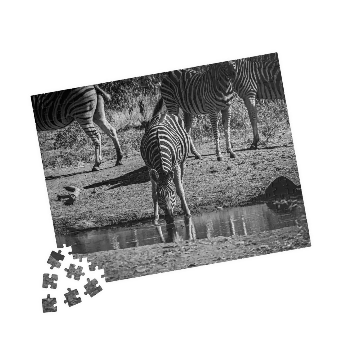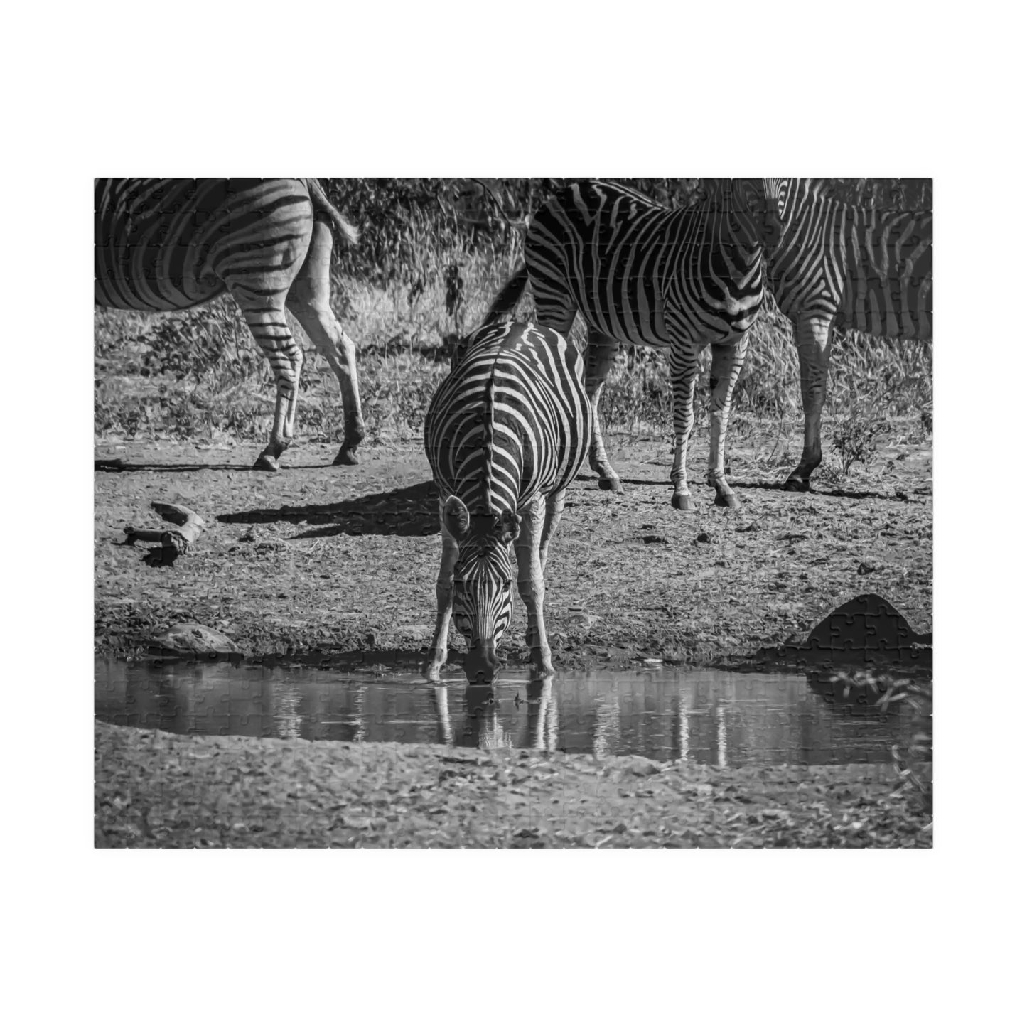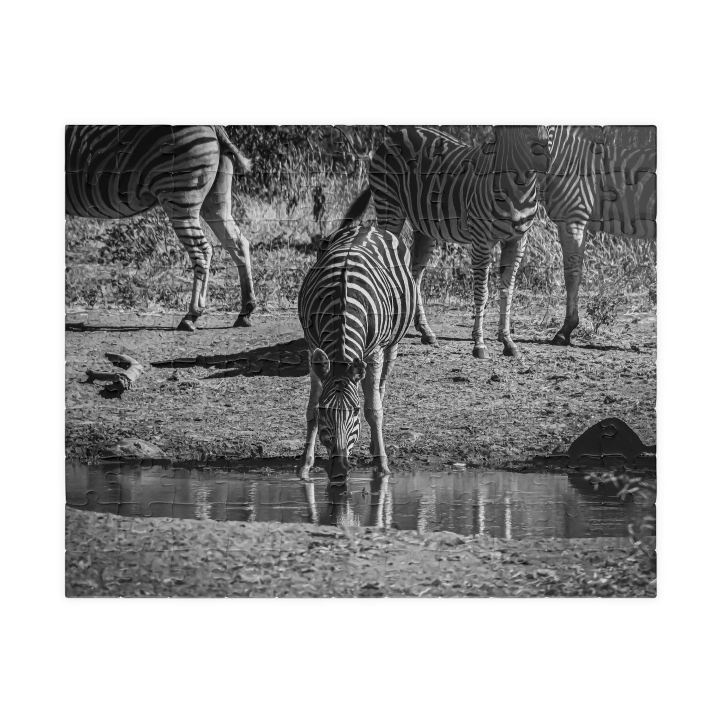 African Zebra Jigsaw Puzzle featuring a photo of a zebra drinking from a waterhole. This puzzle brings a touch of wildlife and nature into your home, perfect for animal lovers and enthusiasts. Ideal for leisurely evenings or weekends, it is a great way to relax and unwind. It is also perfect for gifting on birthdays, holidays, or as a thoughtful surprise for someone special.