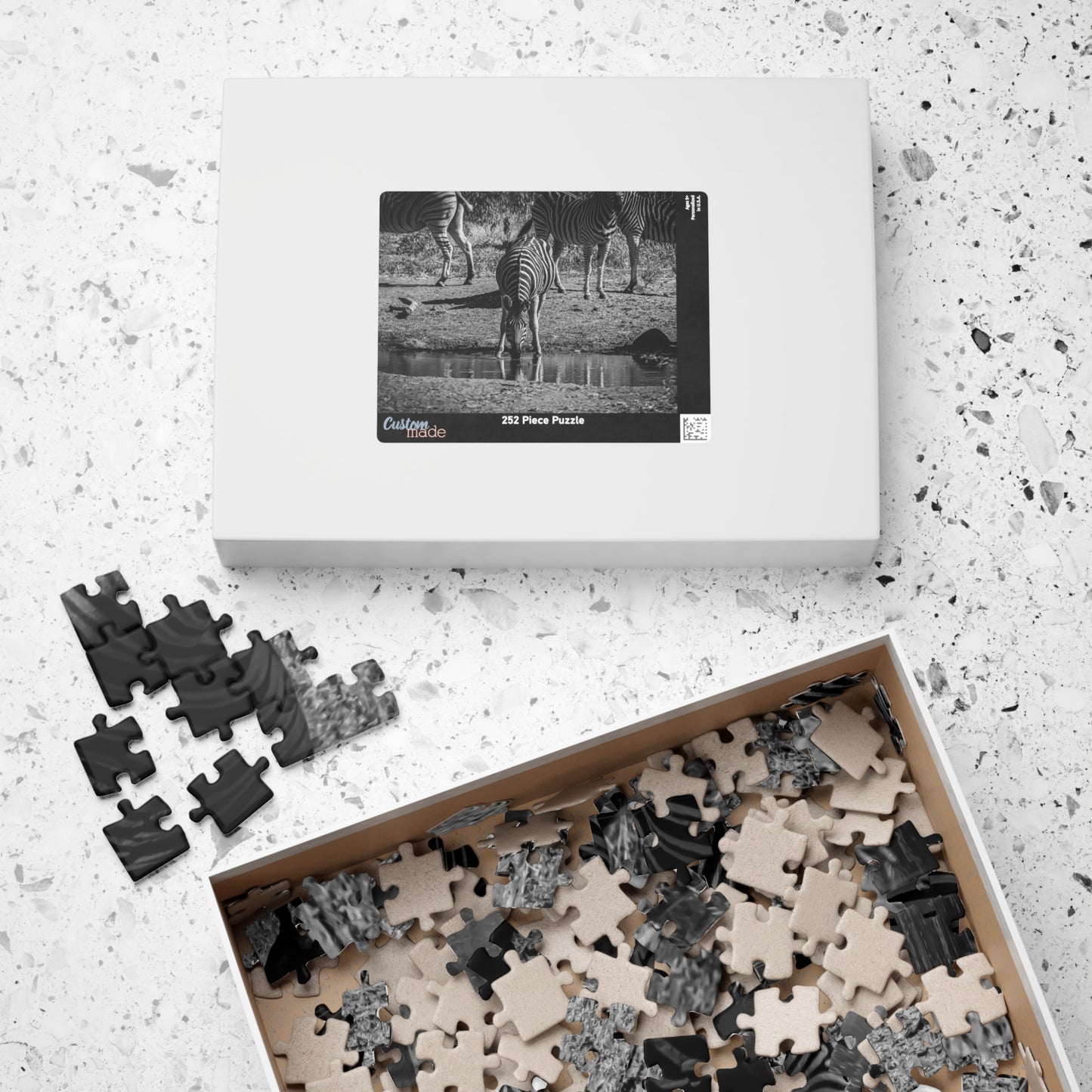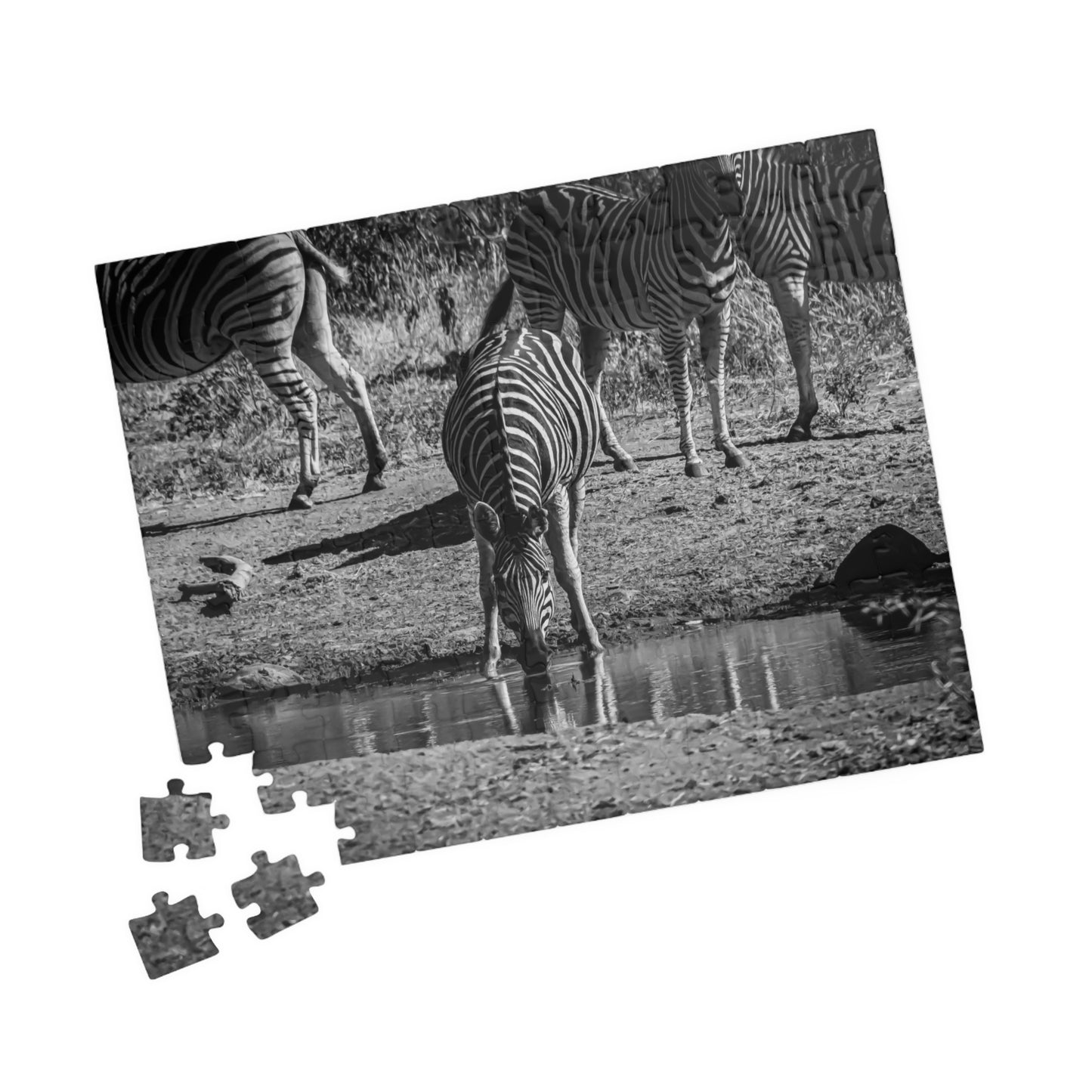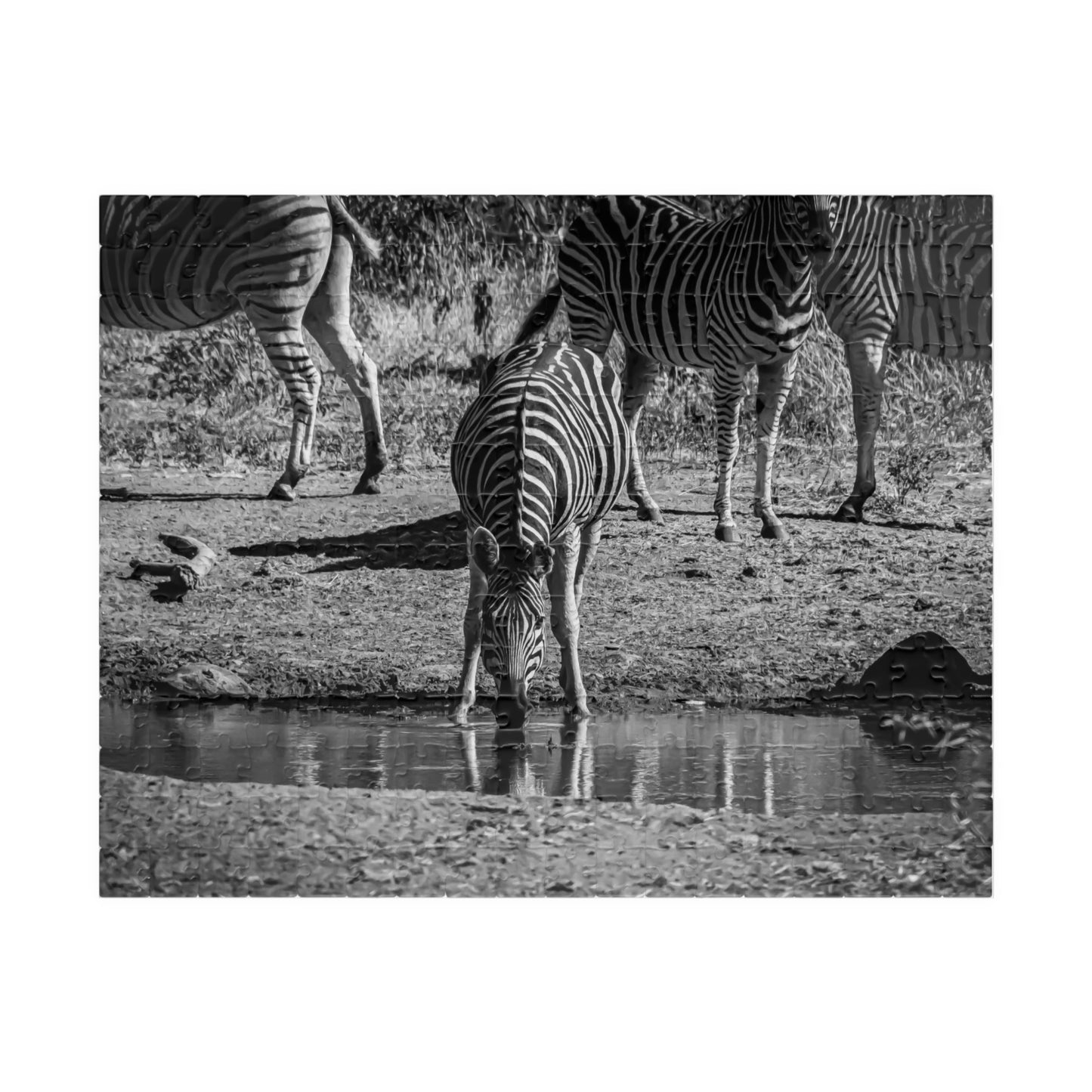 African Zebra Jigsaw Puzzle featuring a photo of a zebra drinking from a waterhole. This puzzle brings a touch of wildlife and nature into your home, perfect for animal lovers and enthusiasts. Ideal for leisurely evenings or weekends, it is a great way to relax and unwind. It is also perfect for gifting on birthdays, holidays, or as a thoughtful surprise for someone special.