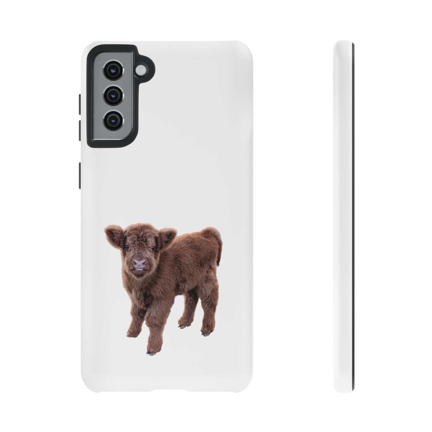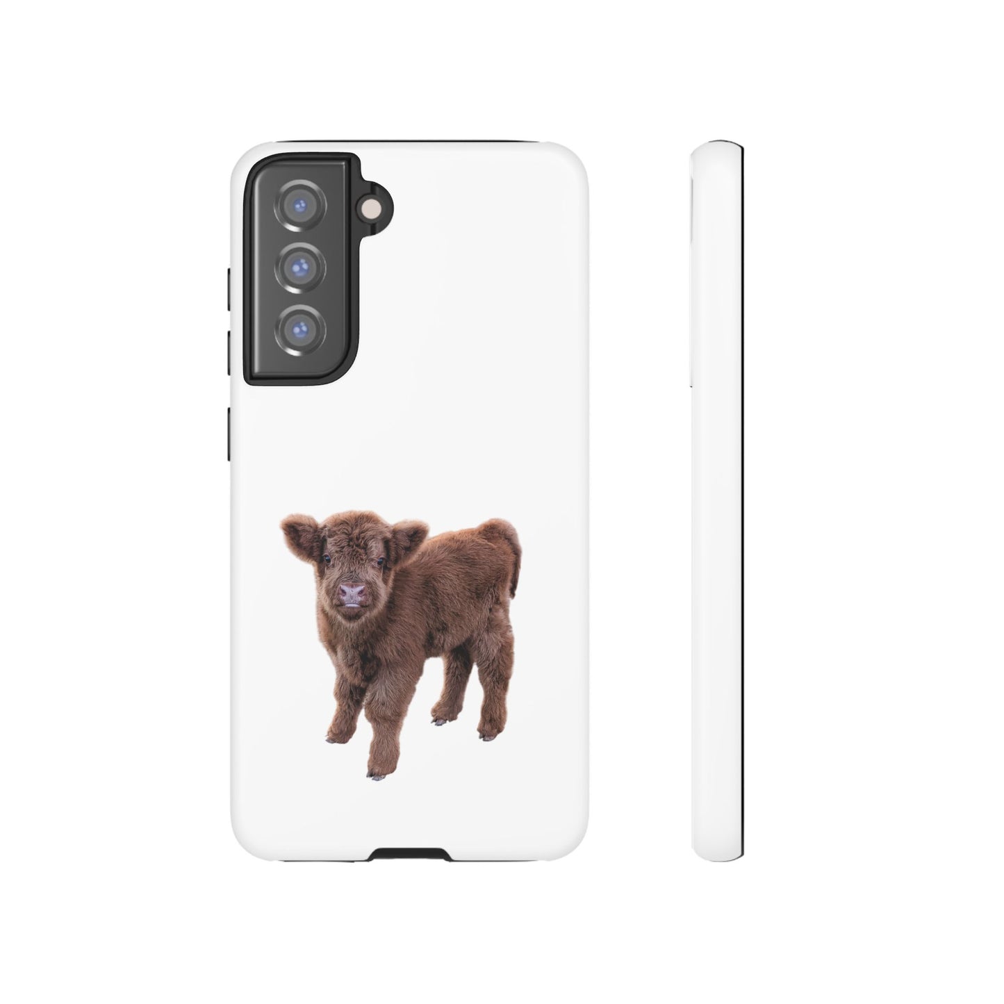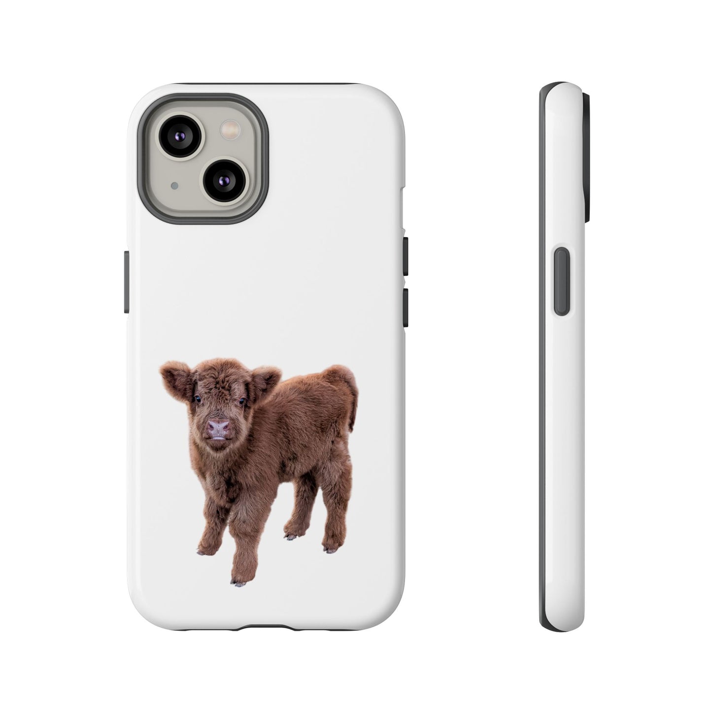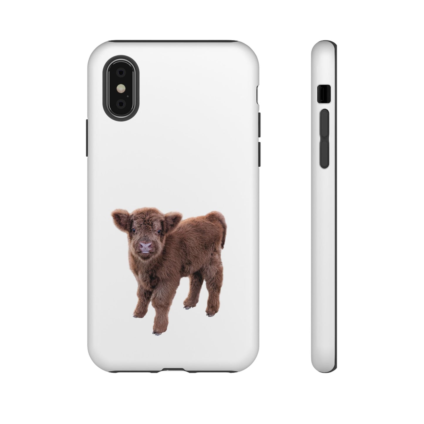 A baby highland cow phone case featuring a photo of a highland calf. This durable and impact-resistant phone case provides excellent shock absorption, protecting your phone from drops and tears. Perfect for adults looking to add some cute and rugged charm to their phone accessories. Ideal for animal lovers and those who appreciate nature. Great gift for wildlife enthusiasts, farmers, and those who love the Scottish Highlands.