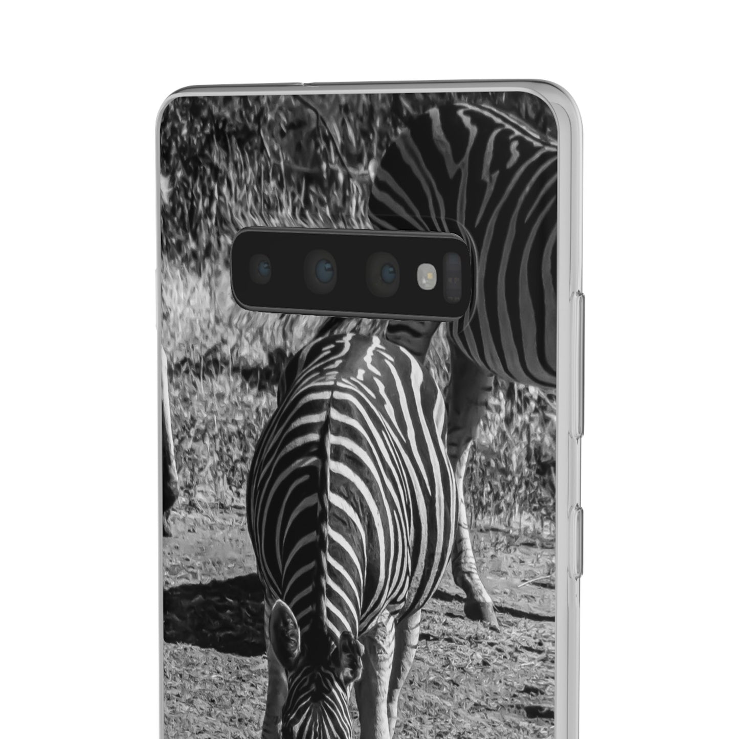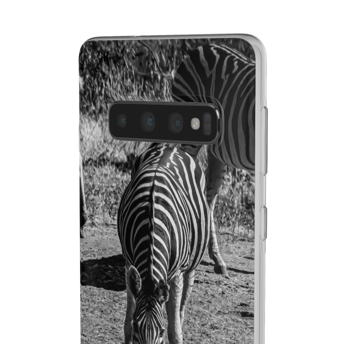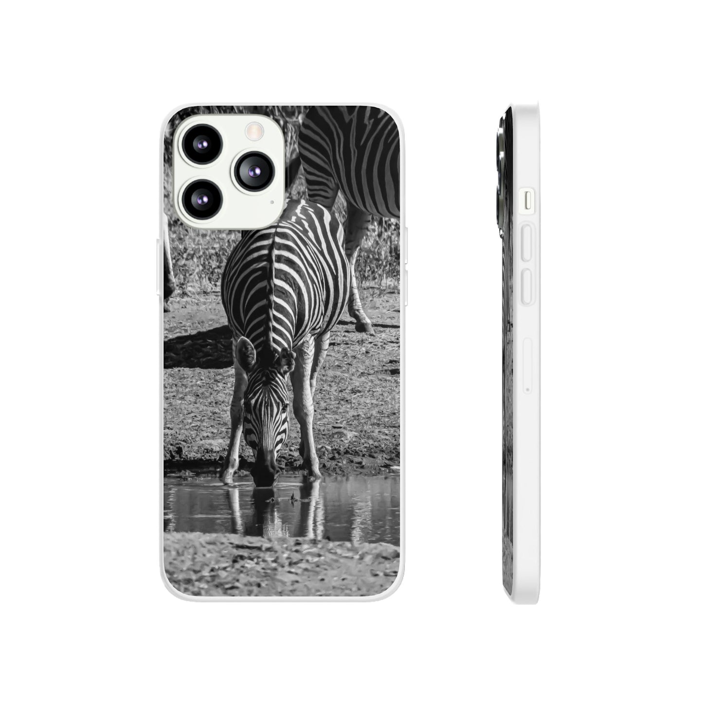 This flexible Zebra Phone Case features a photo of a zebra drinking from a waterhole. It offers flexibility, an impact-absorbing design, and durable material. This phone case is perfect for adults looking to protect their phones in style, especially for animal lovers or those celebrating wildlife conservation efforts.