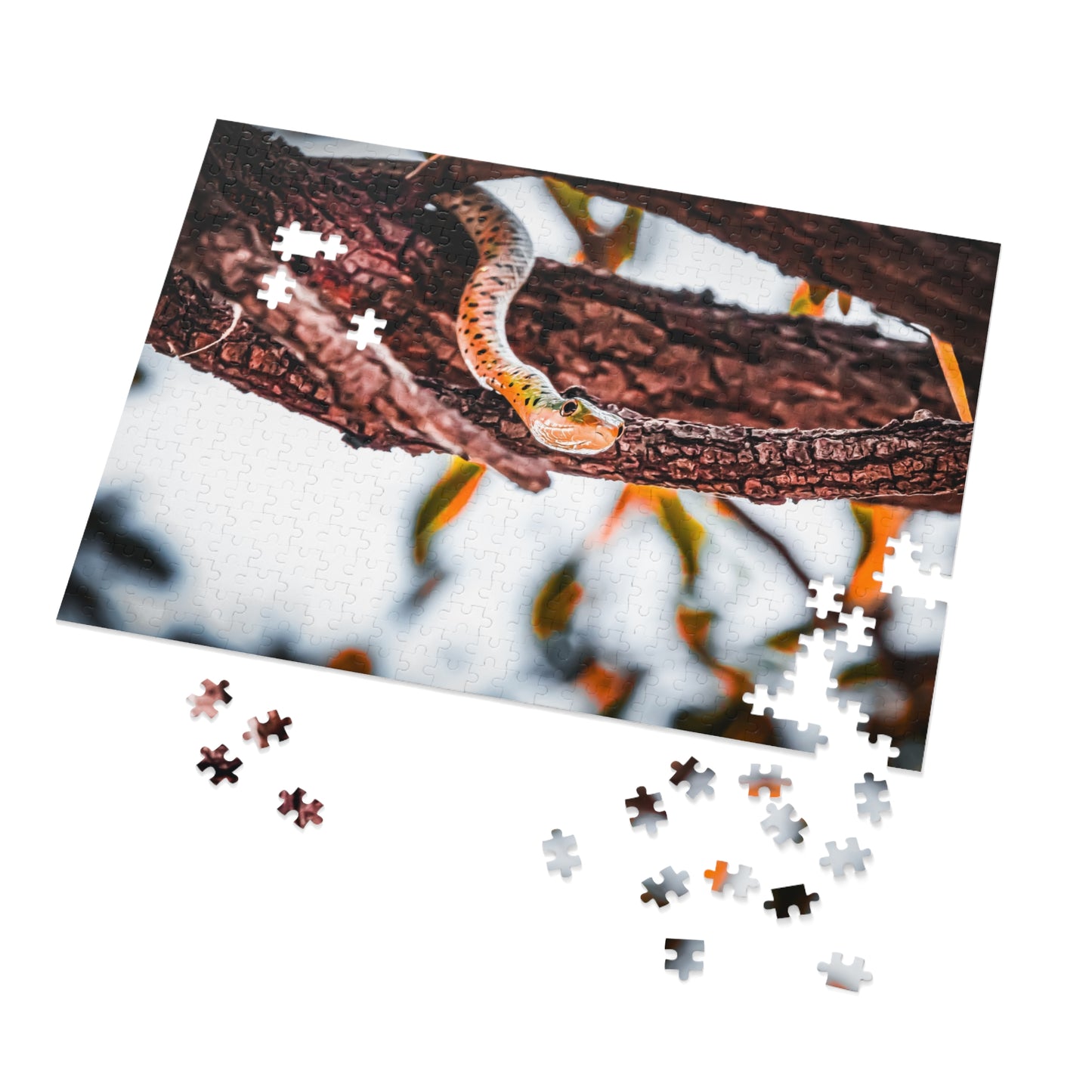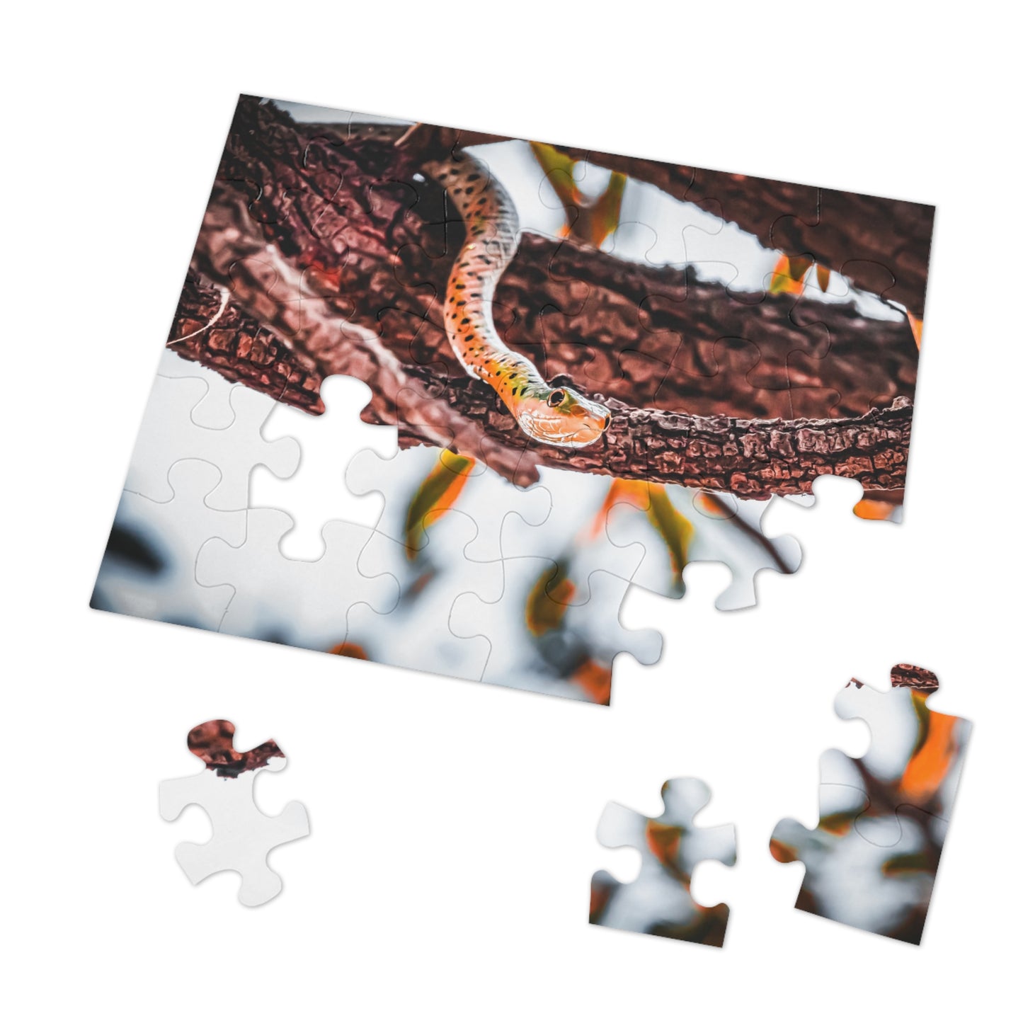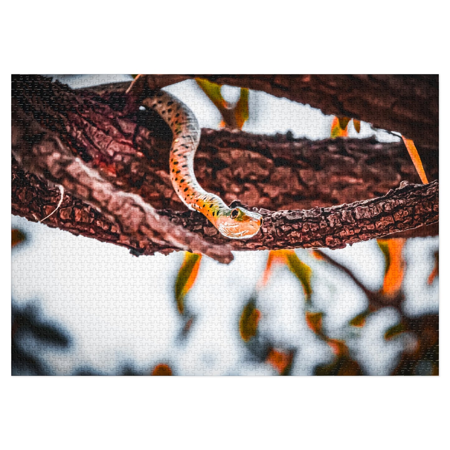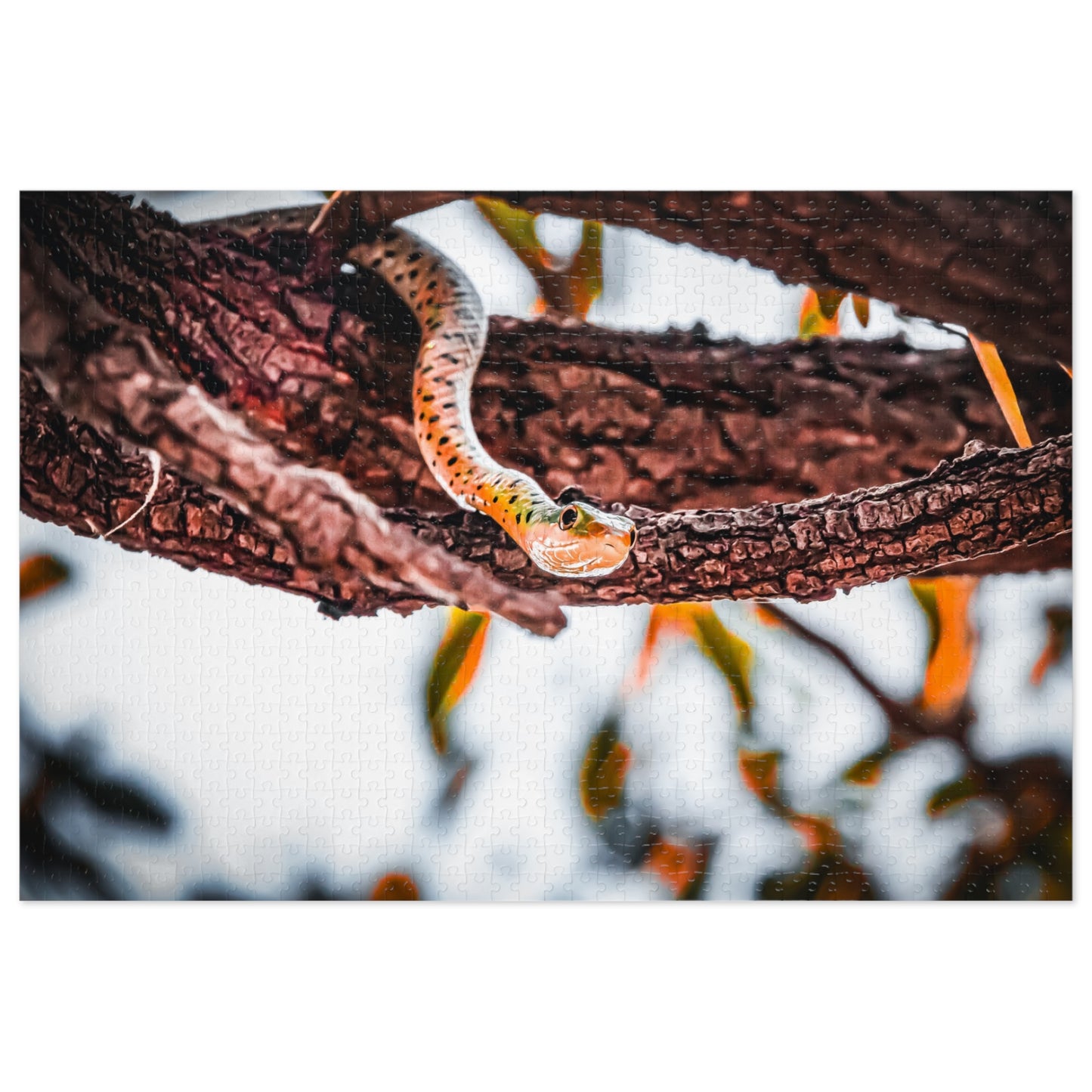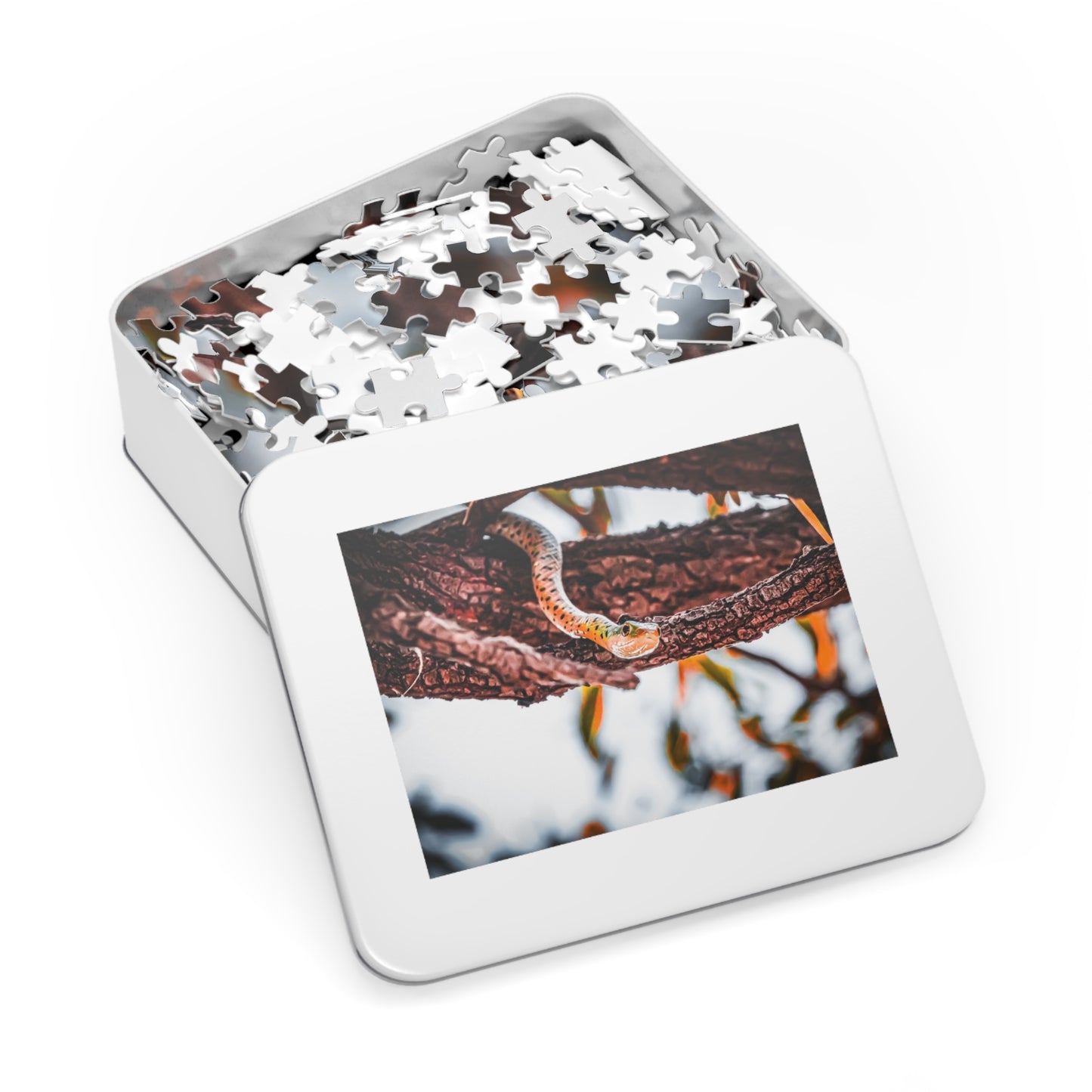 Spotted Bush Snake Puzzle with tin featuring a photo of a spotted bush snake, perfect for animal lovers and puzzle enthusiasts. This vibrant and glossy puzzle comes in 30, 110, 252, 500, 1000 or 2000-piece options, allowing for a customisable and challenging experience. Great for relaxing solo time or bonding with family and friends over a shared love for wildlife.