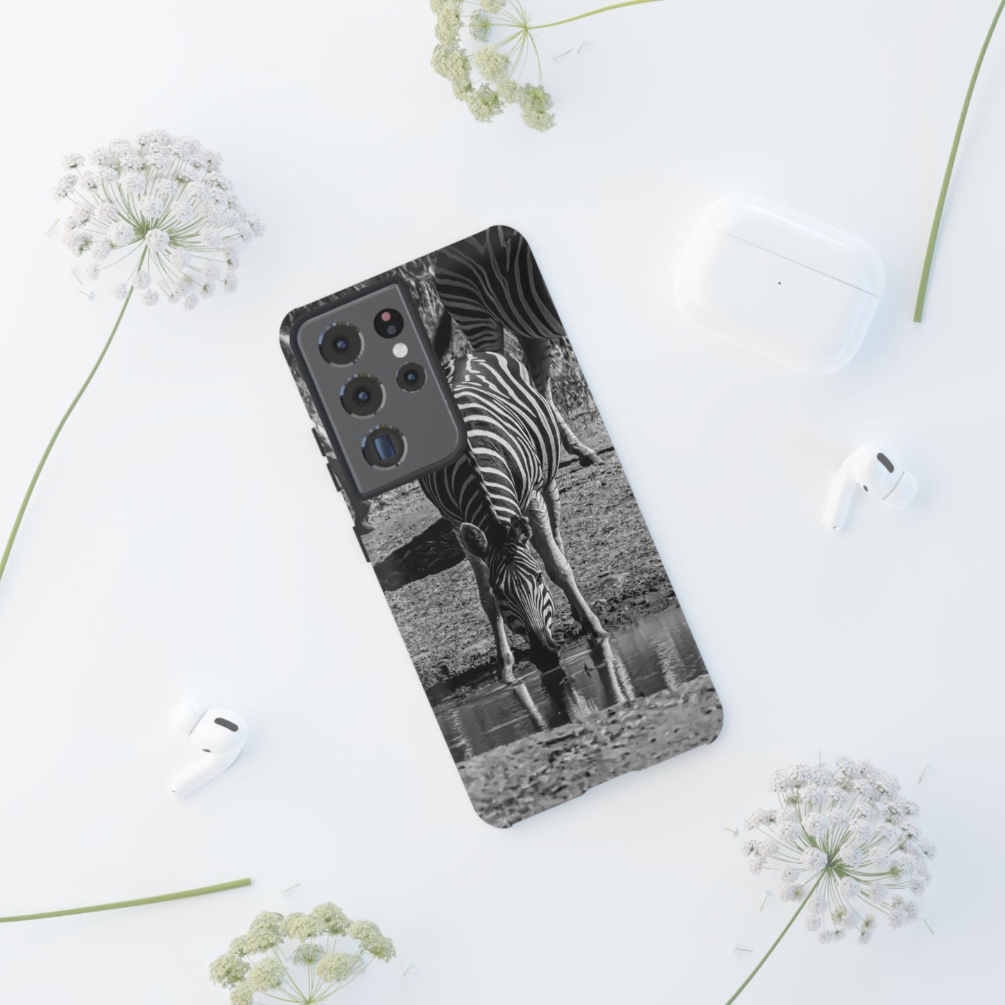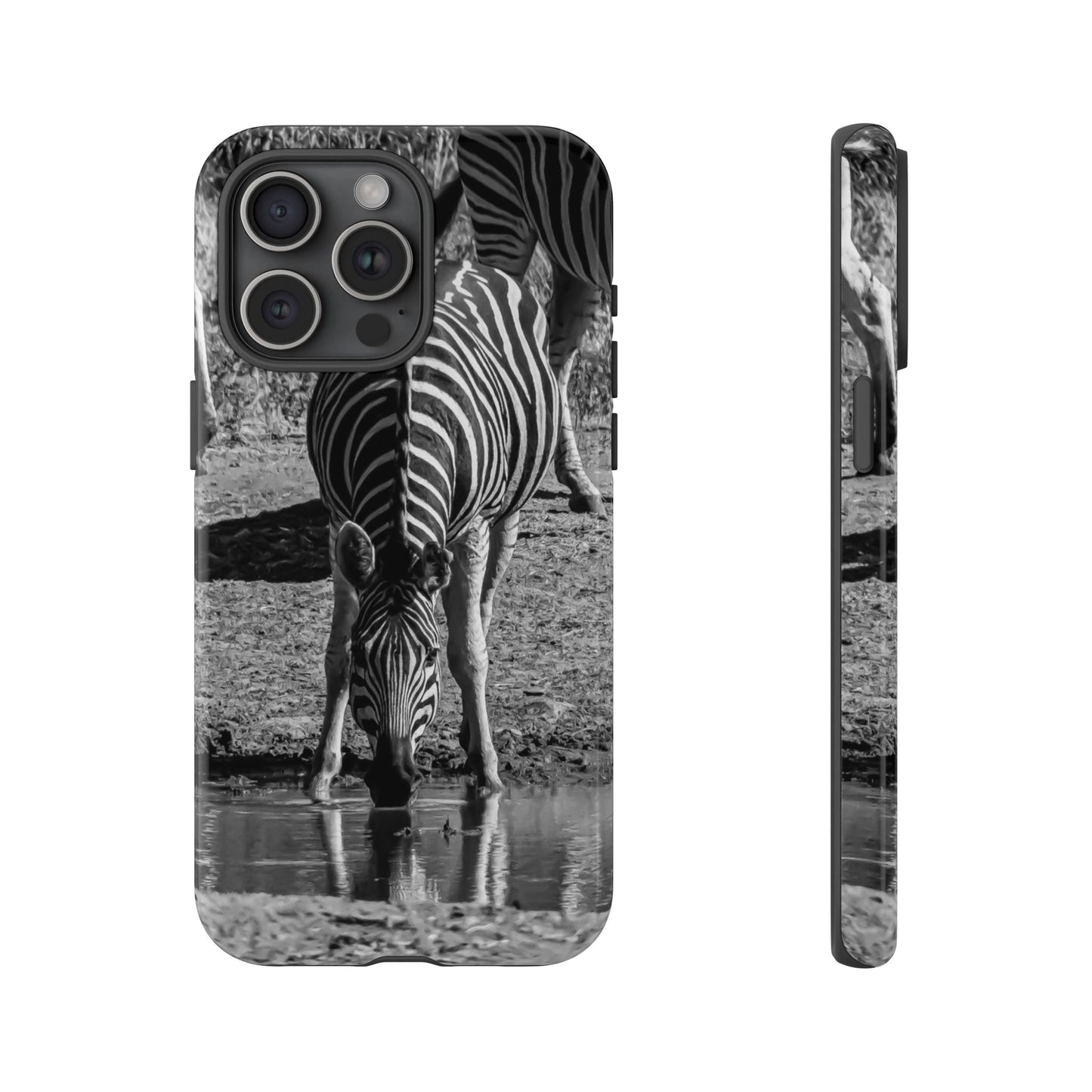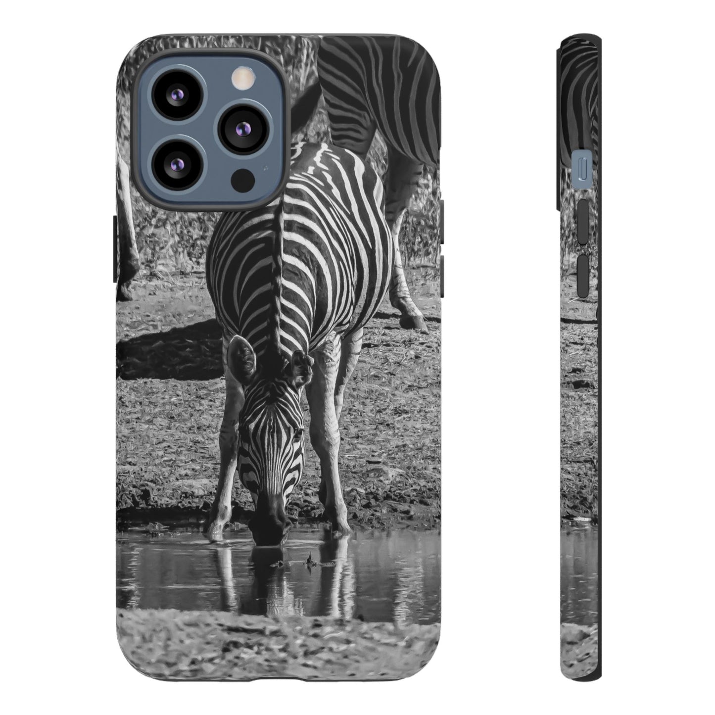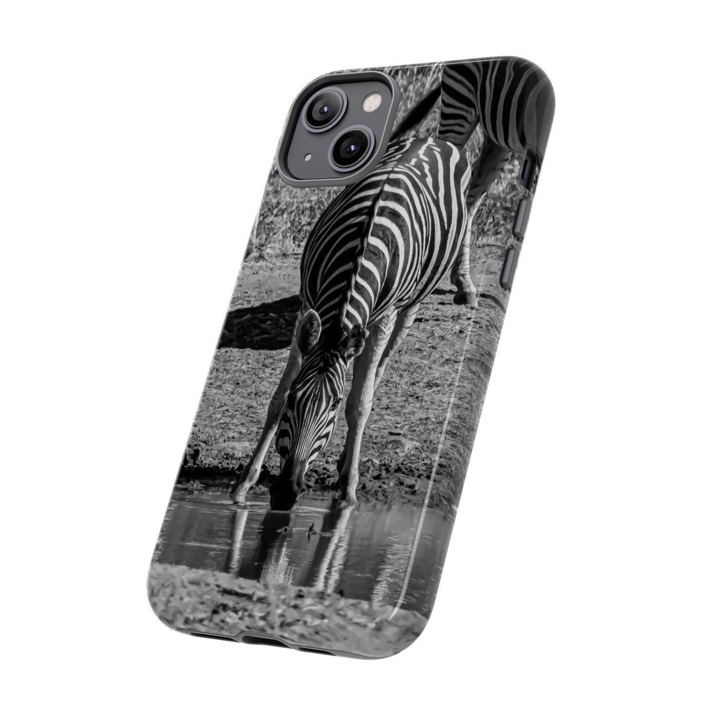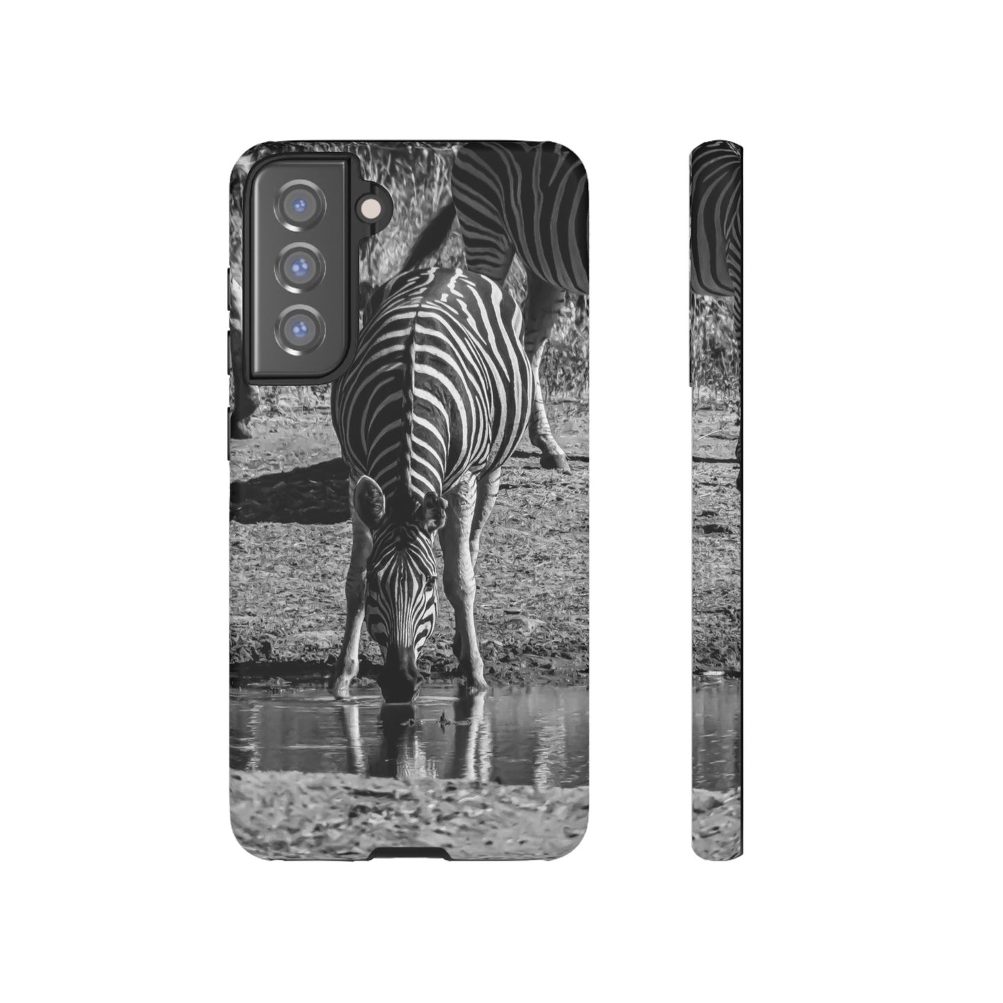 Explore our vibrant phone cases adorned with a zebra drinking from a waterhole. Protect your phone with art that celebrates the beauty of nature.