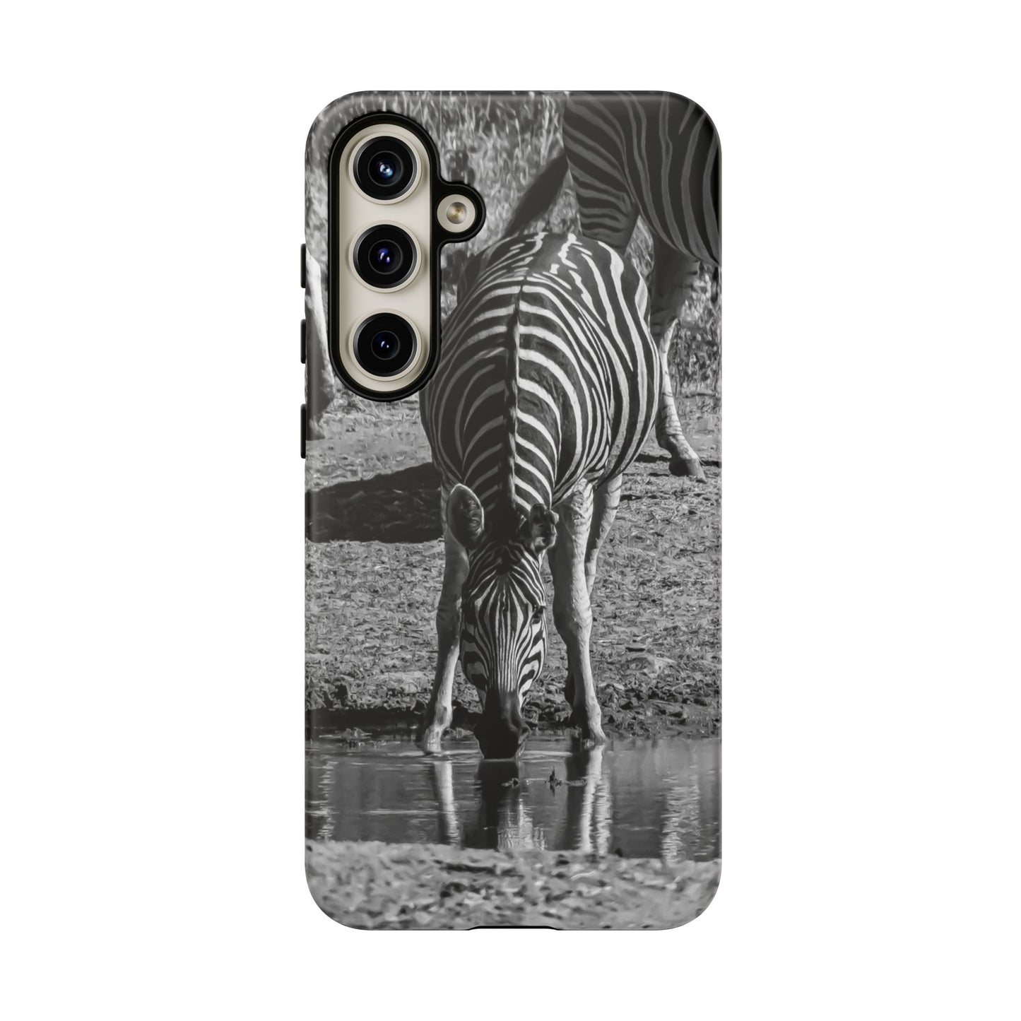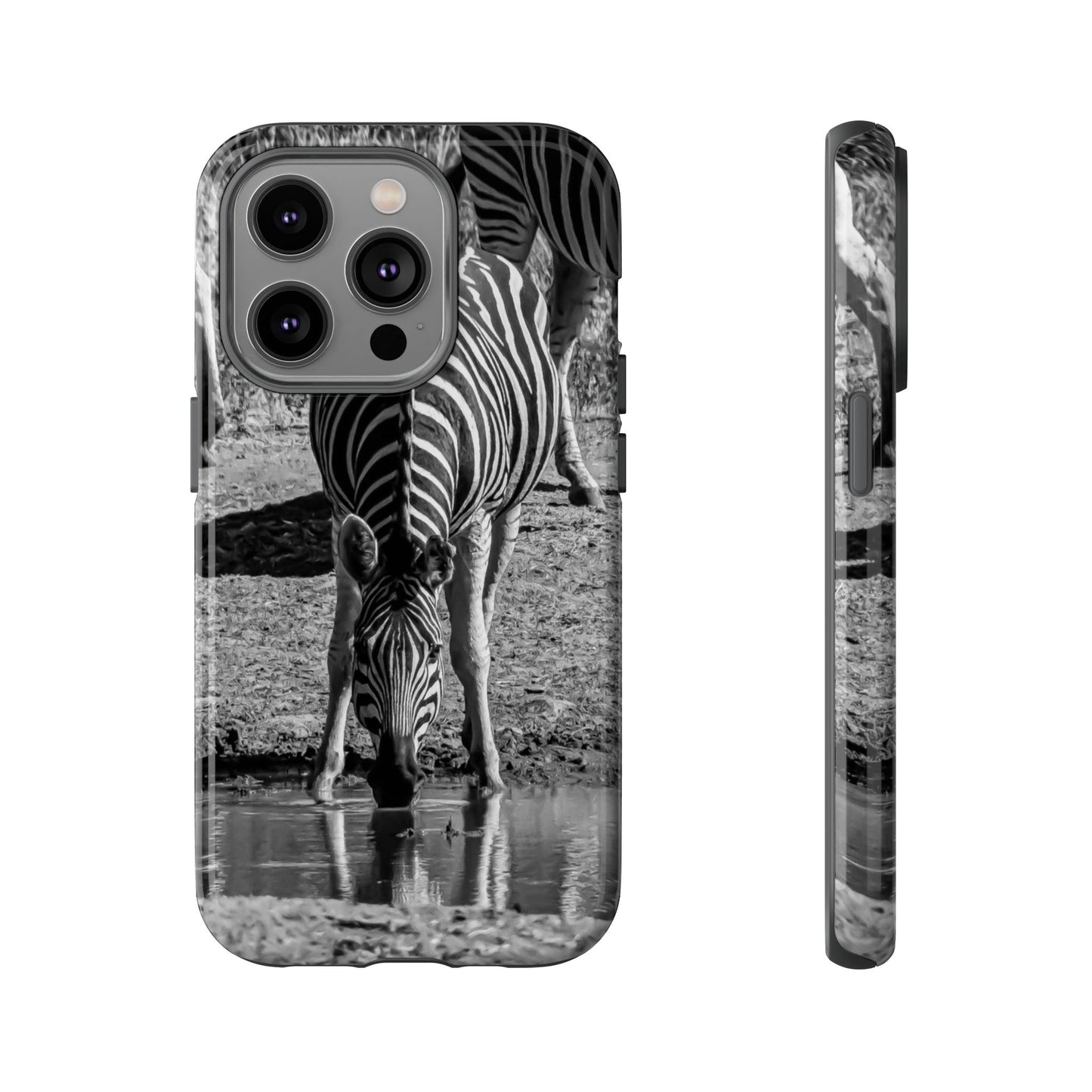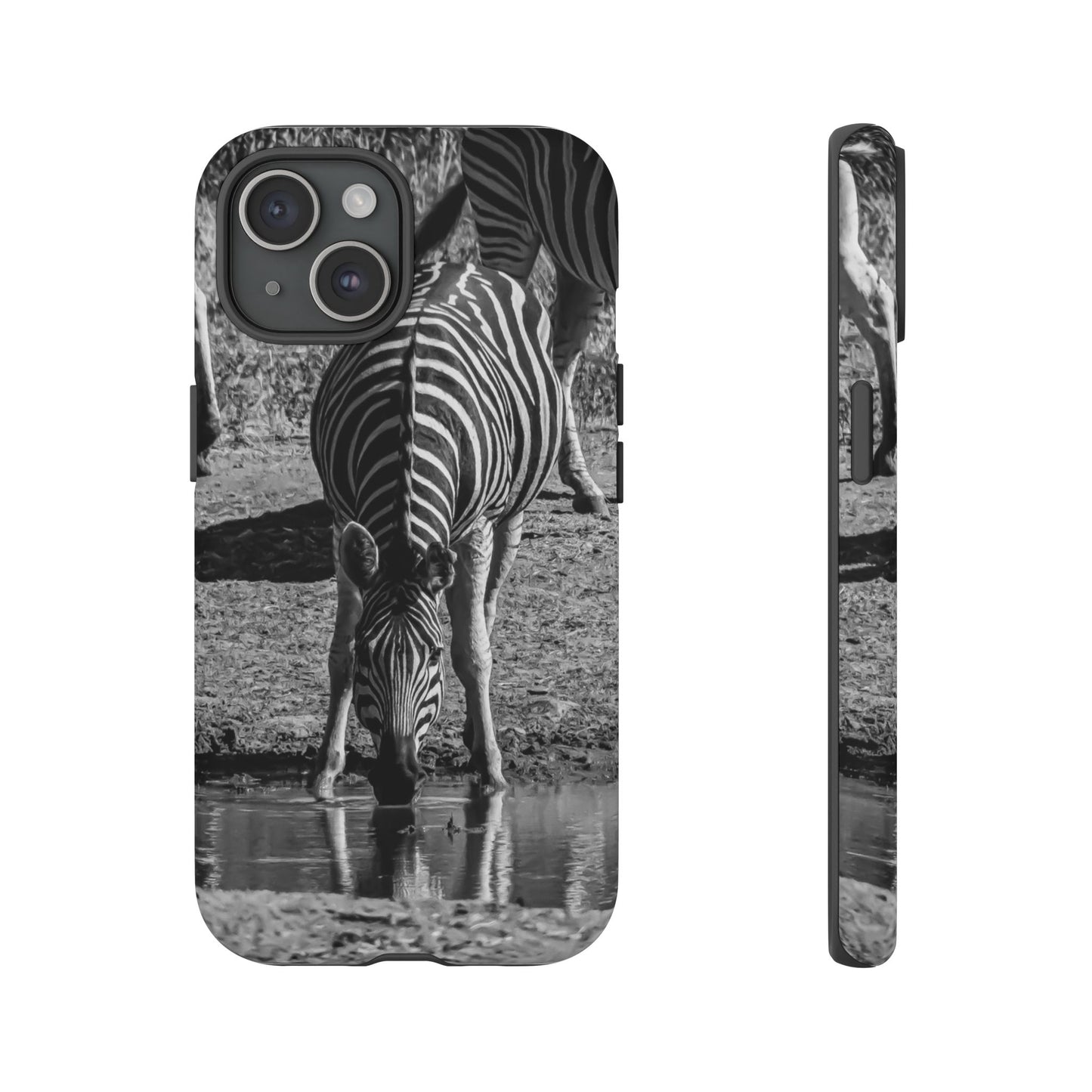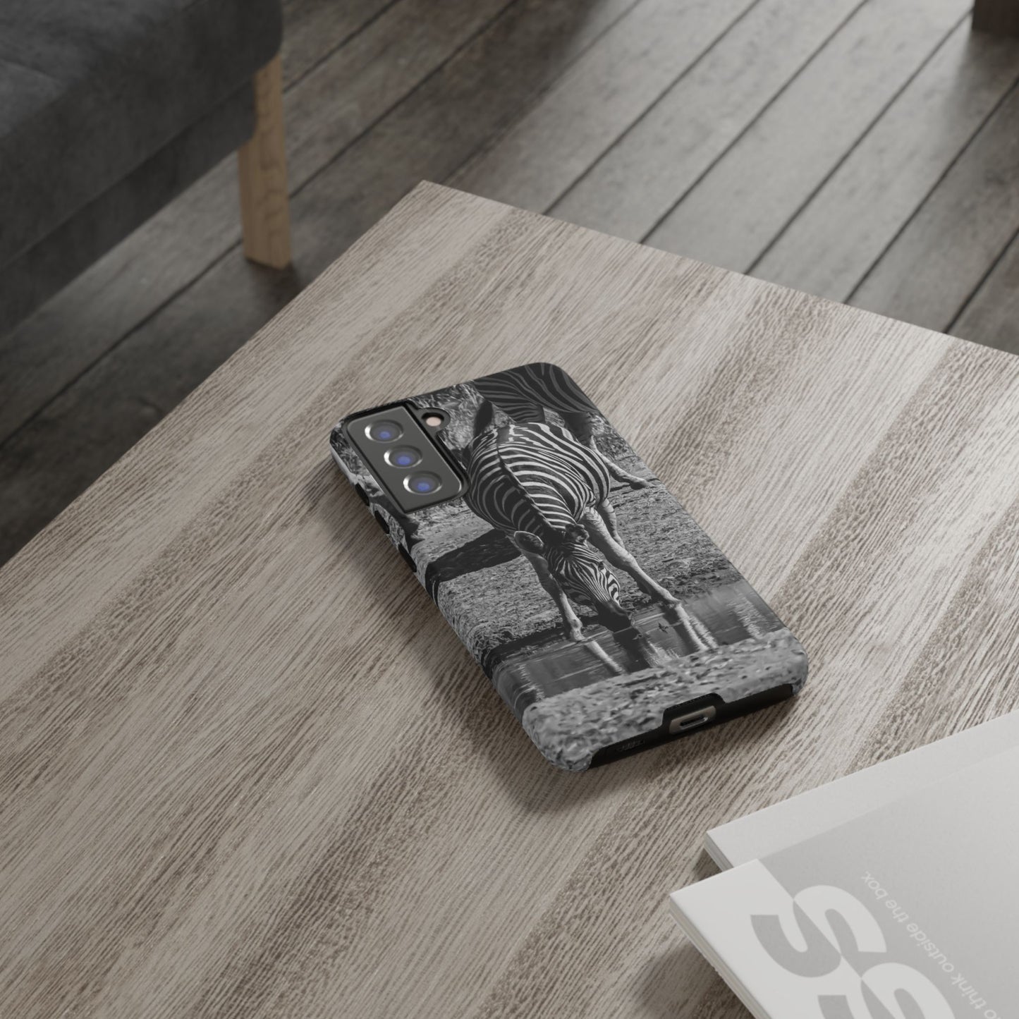 Explore our vibrant phone cases adorned with a zebra drinking from a waterhole. Protect your phone with art that celebrates the beauty of nature.