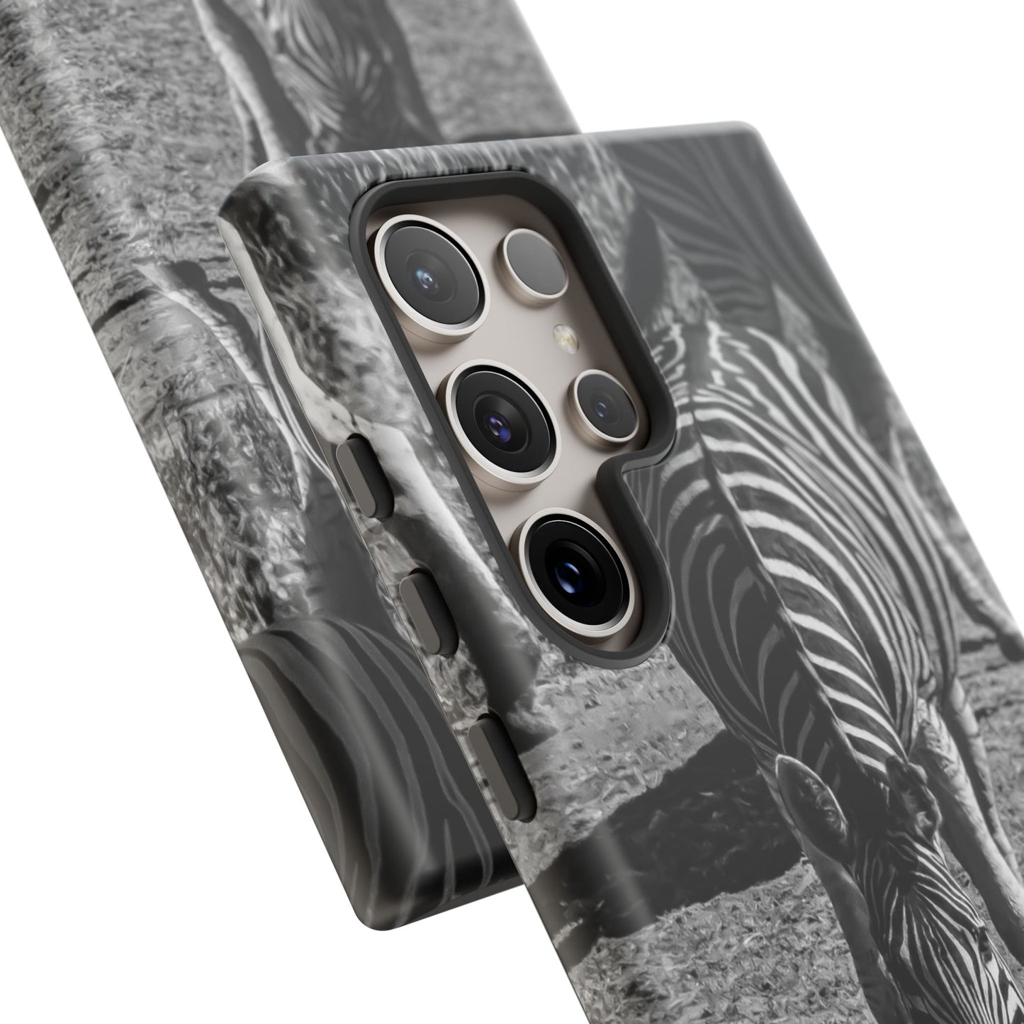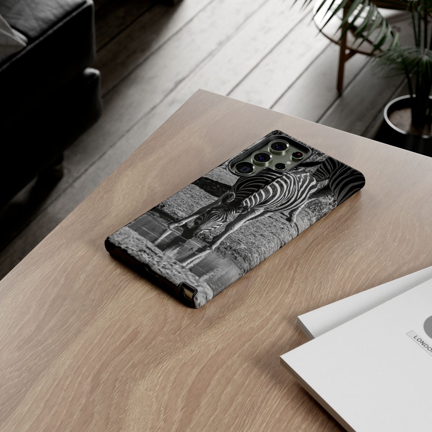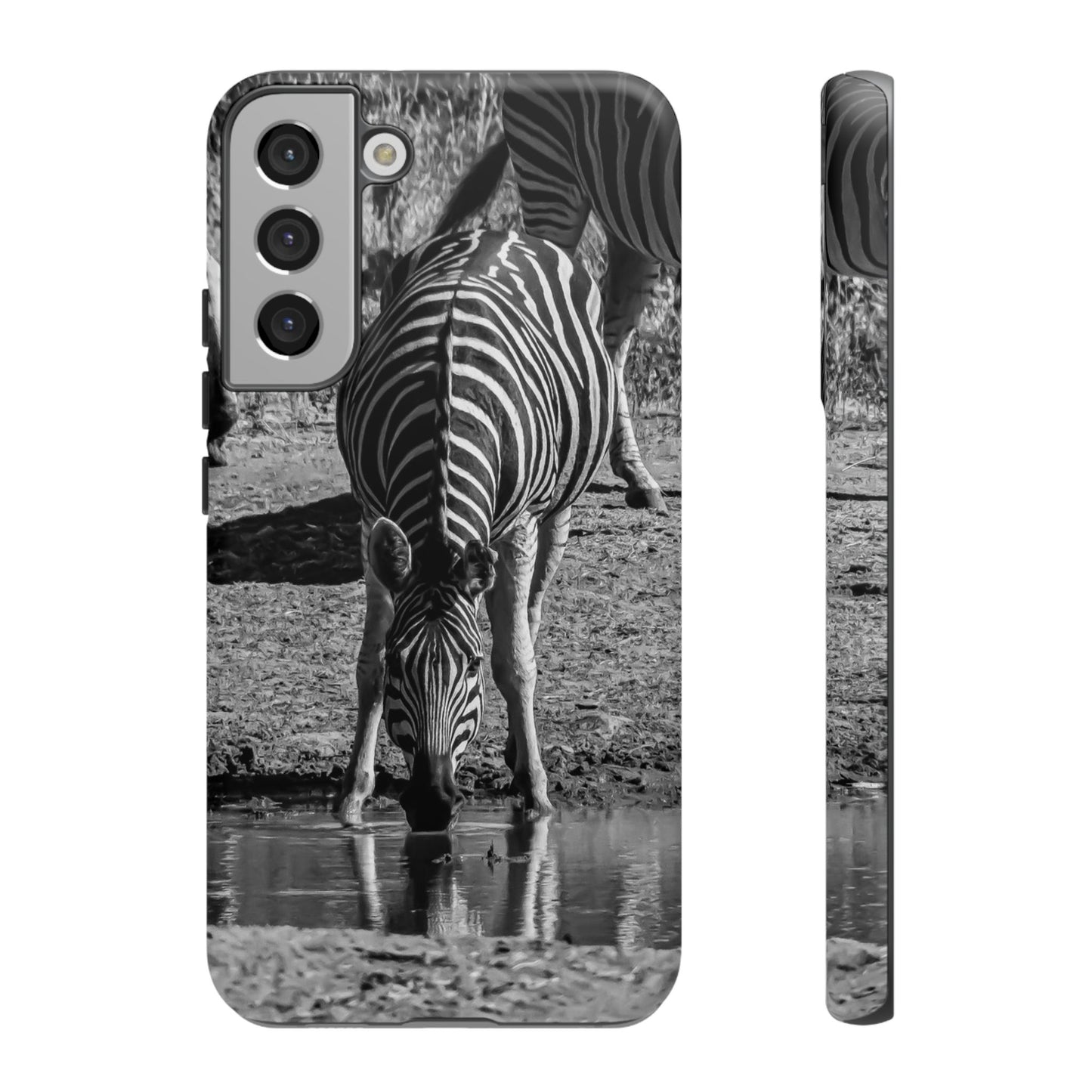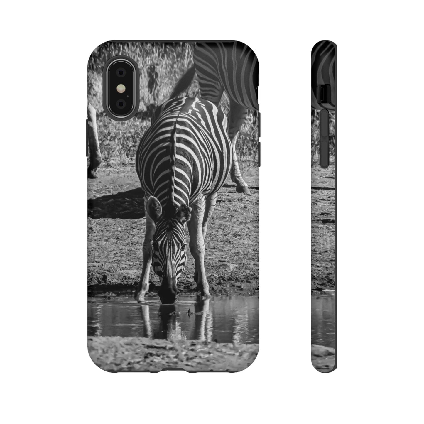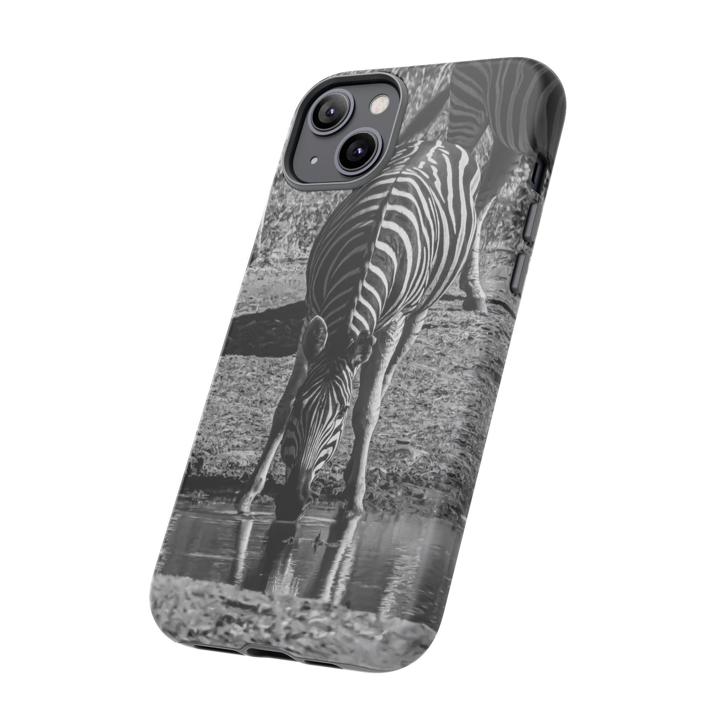 Explore our vibrant phone cases adorned with a zebra drinking from a waterhole. Protect your phone with art that celebrates the beauty of nature.